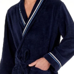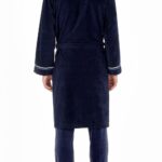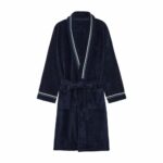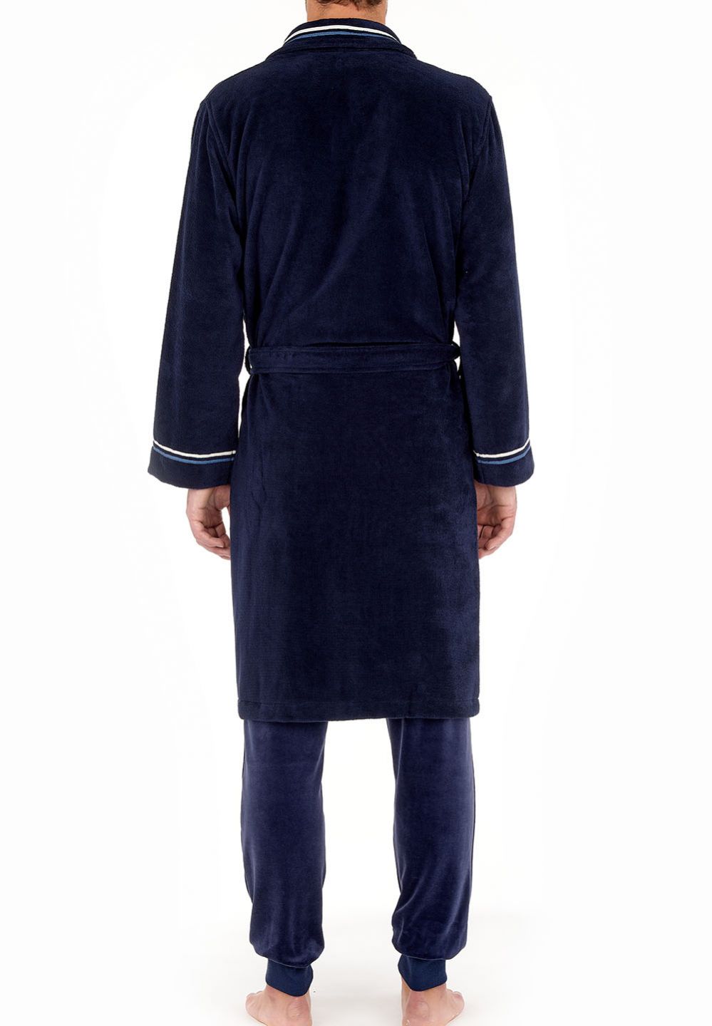 Le peignoir pour hommes TRANSAT est en velours de coton, ultra-doux et confortable. Il est de couleur unie, bleue marine aux finitions rayées blanches et bleues claires sur le col et aux extrémités de manches. Pour cultiver l’élégance jusque dans la décontraction...  Existe en taille M à XXL à 135€
